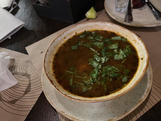 В харчо було три шматочки м'яса, але їх було неможливо з'їсти, вони були жорсткі. Я обожнюю харчо, але це було віддалено від того, що має бути.