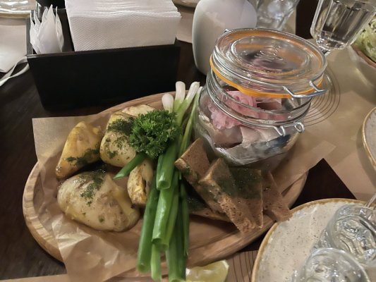 Елементарні страви довго чекали. Замовили скумбрінашвілі з грінками. Замість грінок принесли звичайний хліб, картопля була жорсткою і, безумовно, не свіжоприготовленою. Сама скумбрія була зі шкіркою, подача схожа на домашню. Зелена цибуля невідомо до чого.
